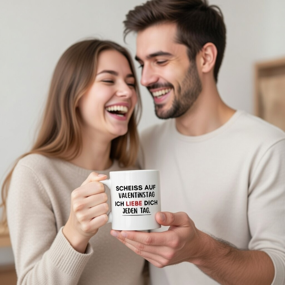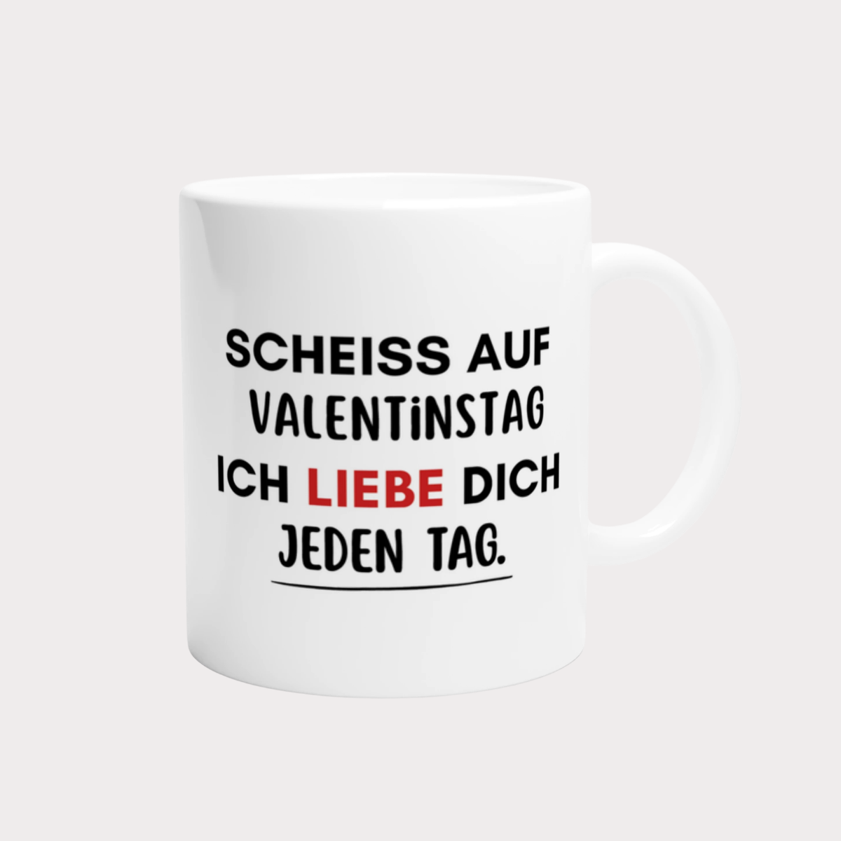 Eine Tasse für jeden Tag – nicht nur für den 14. Februar. Während der Valentinstag oft mit viel Aufwand und Kommerz verbunden ist, braucht echte Zuneigung keinen bestimmten Termin. Diese schlichte Keramiktasse bringt genau das auf den Punkt: „Scheiß auf Valentinstag – Ich liebe dich jeden Tag.“ Das Design zeigt den klaren Spruch in schwarz-rot kombiniert mit einem dezenten roten Herz – unaufdringlich, ehrlich und ohne übertriebenen Kitsch. Es ist eine kleine, alltägliche Erinnerung daran, dass Liebe sich in den normalen Momenten zeigt, nicht nur an Feiertagen.