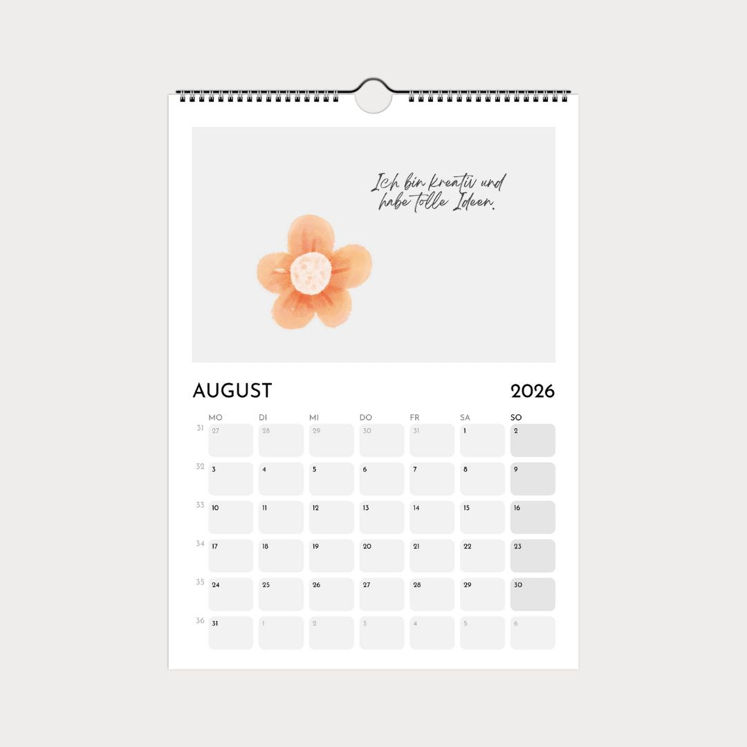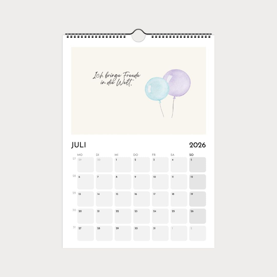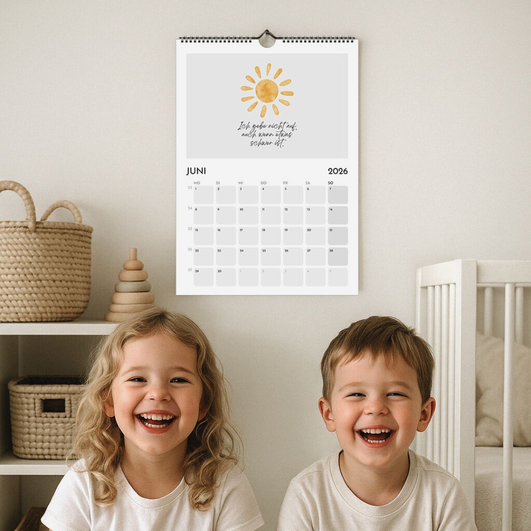 Jeder Monat bringt einen fröhlichen Spruch, der Kinder ermutigt, an sich zu glauben, Neues auszuprobieren oder einfach stolz auf sich zu sein. Kombiniert mit modernen Farben und klarer Typografie wird der Kalender zum inspirierenden Begleiter im Alltag. So lernen Kinder spielerisch, dass jeder Tag etwas Gutes bereithält.