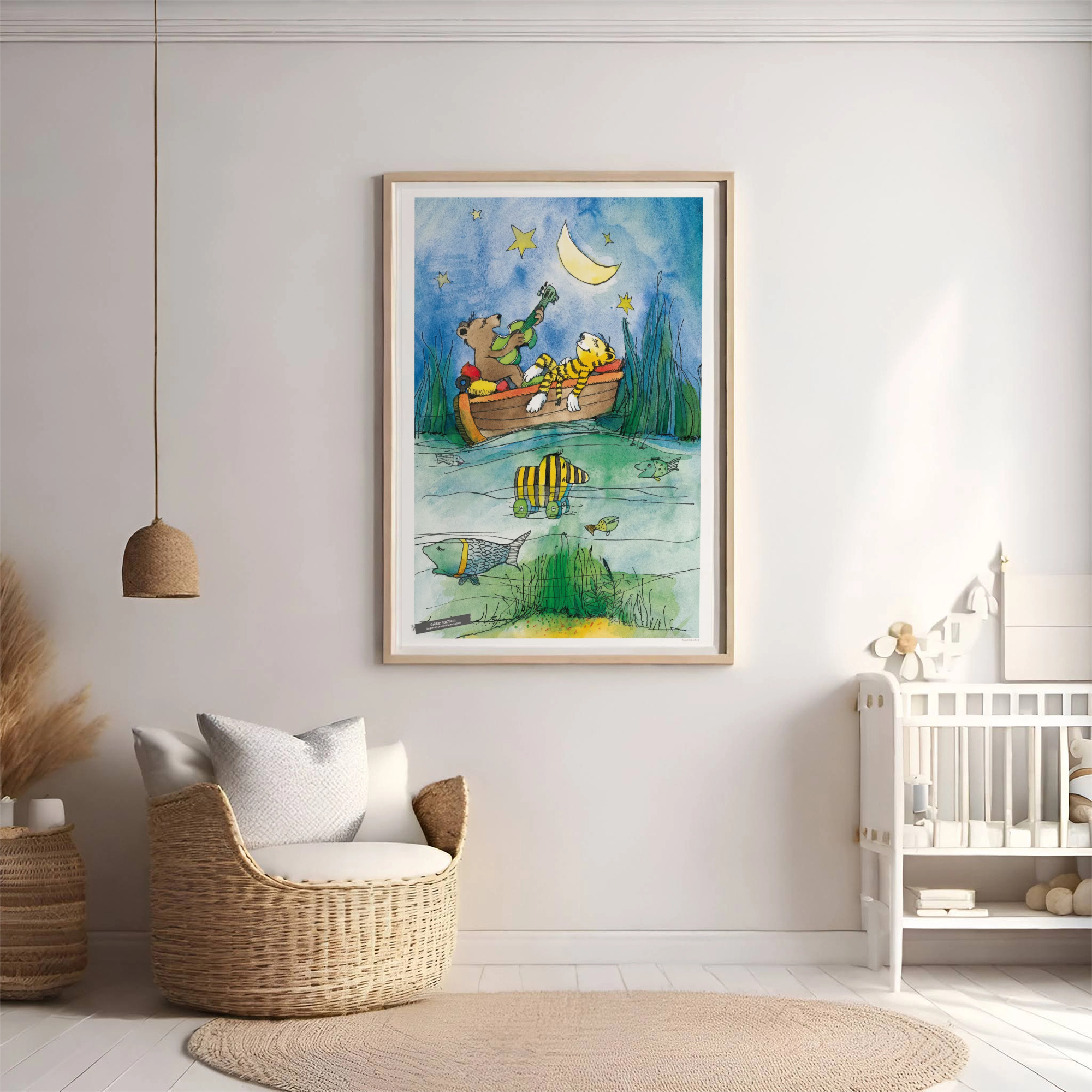 Eine träumerische Szene im silbernen Mondlicht: Das Originalmotiv „Mondscheinmusik“ zeigt Janosch-typische Figuren mit Nachtinstrumenten in einer ruhigen, magischen Umgebung. Es vermittelt Fantasie, Gelassenheit und musikalische Träumerei – perfekt fürs Kinderzimmer oder die Kuschelecke. Gedruckt auf seidenmattem, FSC-zertifiziertem Feinpapier, bietet dieses Poster eine besonders hochwertige Optik und Haptik.
